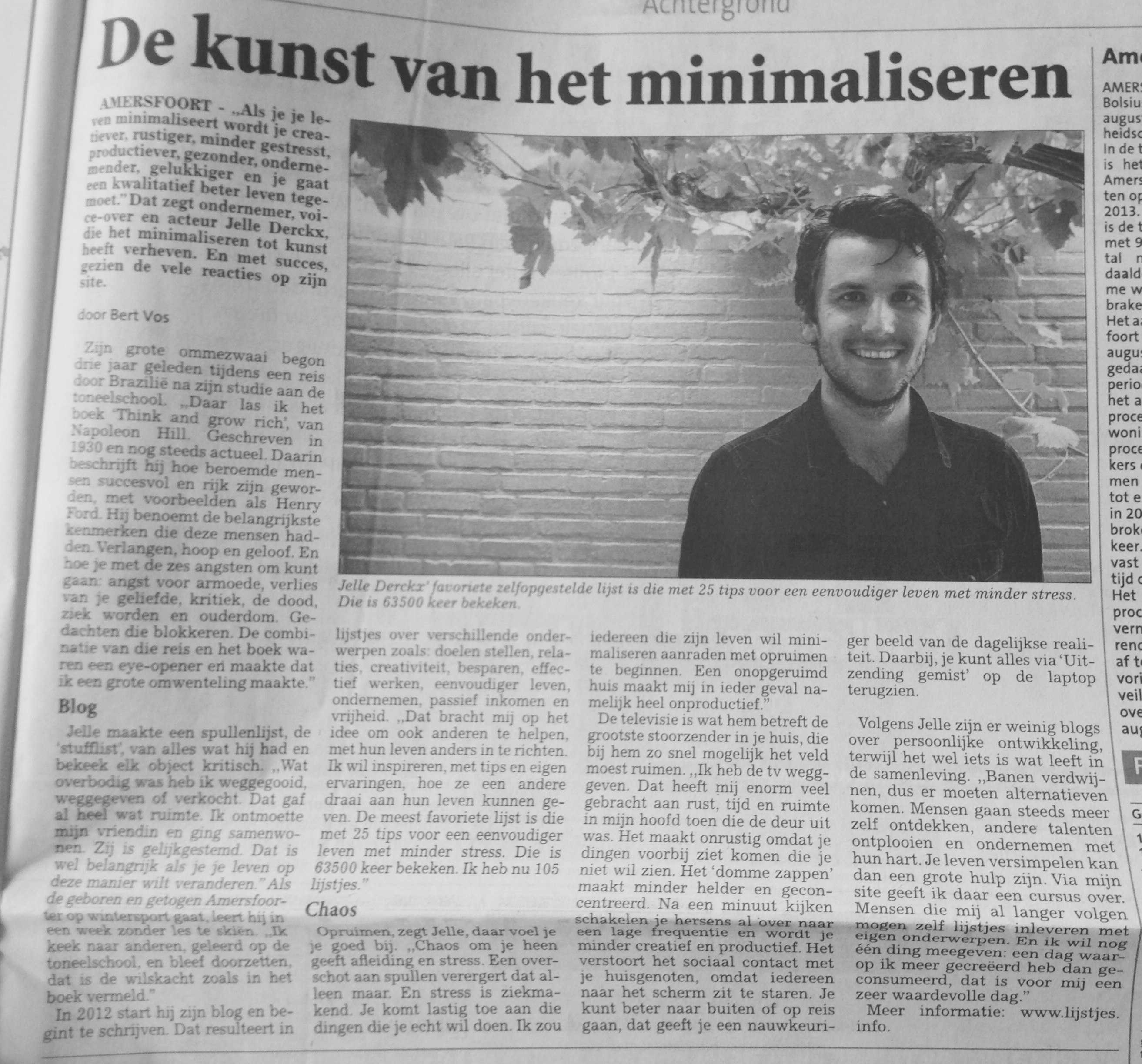 Schrijven. In 2014 heb ik 60 artikelen geschreven voor Lijstjes.info en Blogbouwers. Ook heb ik geschreven voor mijn cursus ‘Minimaliseer je leven in 4 weken’ en het boek ‘IK & MIJN LEVEN’ dat ik in begin 2015 wil lanceren. Schrijven vind ik heerlijk en is iets wat ik altijd wil blijven doen. Mijn blog Jelle Derckx komt daar in 2015 nog bij.